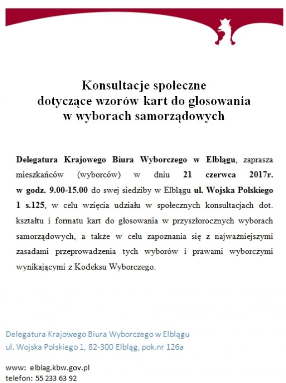 Delegatura Krajowego Biura Wyborczego w Elblągu, zaprasza mieszkańców (wyborców) w dniu 21 czerwca 2017r. w godz. 9.00-15.00 do swej siedziby w Elblągu ul. Wojska Polskiego 1 s.125, w celu wzięcia udziału w społecznych konsultacjach dot. kształtu i formatu kart do głosowania w przyszłorocznych wyborach samorządowych, a także w celu zapoznania się z najważniejszymi zasadami przeprowadzenia tych wyborów i prawami wyborczymi wynikającymi z Kodeksu Wyborczego.