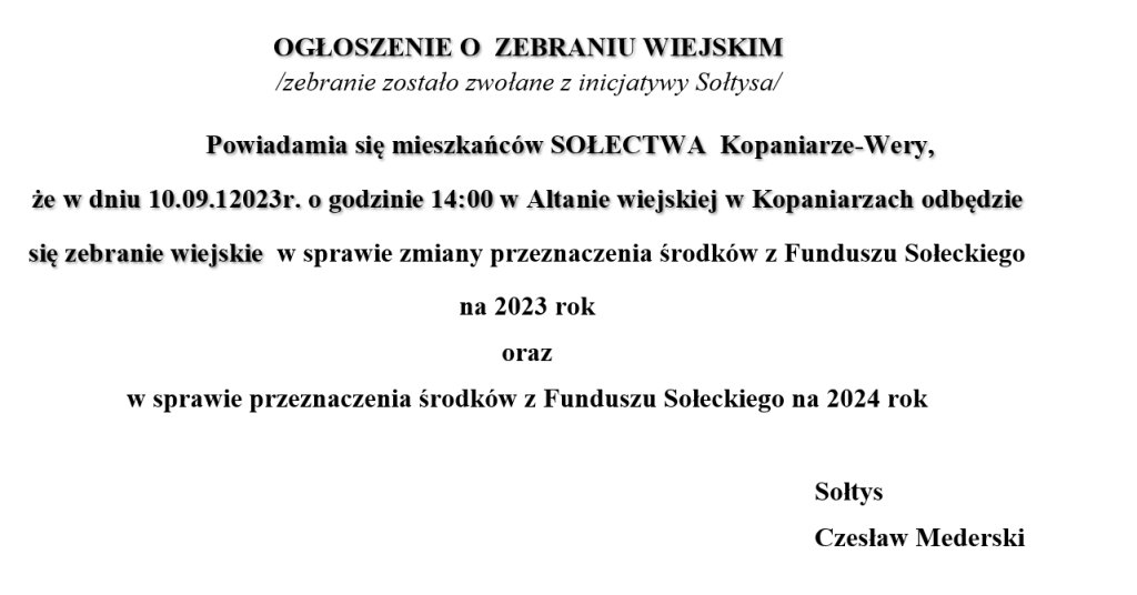 Powiadamia się mieszkańców SOŁECTWA Kopaniarze-Wery, że w dniu 10.09.12023r. o godzinie 14:00 w Altanie wiejskiej w Kopaniarzach odbędzie się zebranie wiejskie w sprawie zmiany przeznaczenia środków z Funduszu Sołeckiego na 2023 rok oraz w sprawie przeznaczenia środków z Funduszu Sołeckiego na 2024 rok.