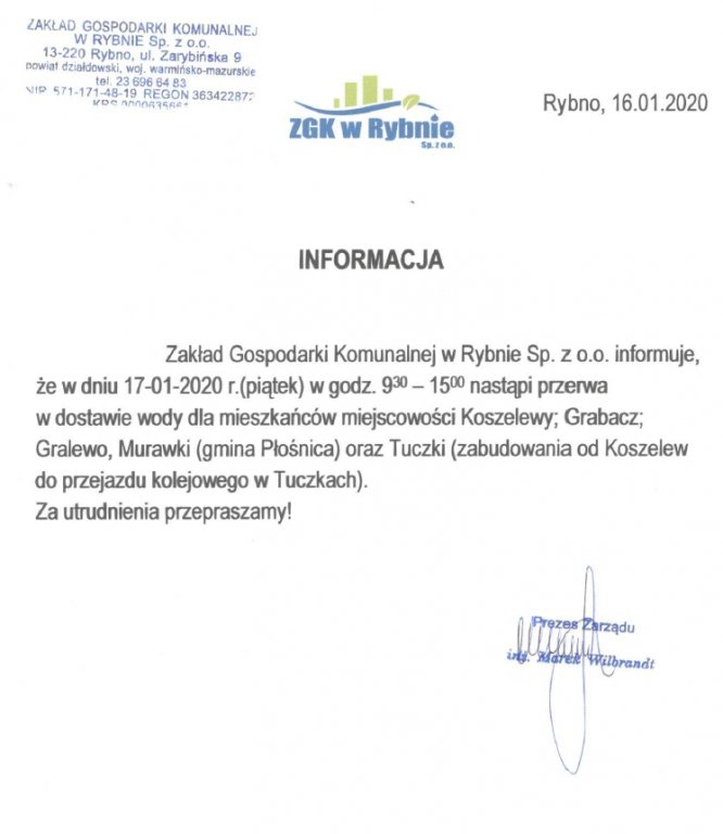 Zakład Gospodarki Komunalnej w Rybnie Sp. z o.o. informuje, że w dniu 17-01-2020 r.(piątek) w godz. 9:30 - 15:00 nastąpi przerwa w dostawie wody dla odbiorców zaopatrywanych z wodociągu publicznego Koszelewy.