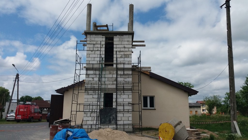 Inwestycję współfinansuje Pan Adam Nowakowski, który na budowę wieży przeznaczył 60.000,00 zł. Na parterze zaprojektowano schody stalowe prowadzące na wieżę, która jako punkt widokowy umożliwia obserwację walorów widokowych i estetycznych terenu. Na wieży zostanie zamontowane urządzenie do suszenia węży pożarniczych oraz syrena alarmowa.