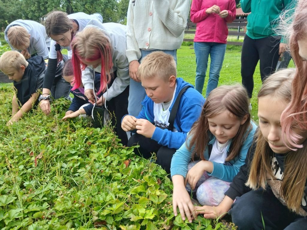 Nie zabrakło również kontaktu ze zwierzętami. Dzieci mogły pogłaskać i dokarmić króliki oraz kozy, a także spróbować świeżych, słodkich poziomek prosto z ogródka. W trakcie spaceru po warzywniku uczniowie przyglądali się, jak rosną różne warzywa, zioła i przyprawy.