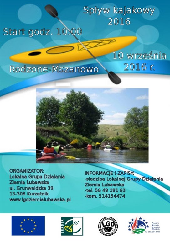 Spływ odbędzie się w dniu 10 września 2016 r. na odcinku rzeki Drwęcy pomiędzy miejscowościami Rodzone i Mszanowo. Rozpoczęcie spływu przewidziano na godzinę 10:00. Organizator zapewnia: ubezpieczenie, posiłek, transport na miejsce spływu. Zbiórka uczestników spływu odbędzie się na parkingu przy restauracji "Zajazd nad Drwęcą".