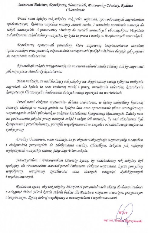 Przed nami kolejny rok szkolny, rok pełen wyzwań, spowodowanych zagrożeniem epidemicznym, któremu wspólnie musimy stawić czoła. 1 września uczniowie wracają do szkół, nauczyciele i pracownicy oświaty do swoich normalnych obowiązków. Wspólnie z dyrektorami szkół robimy wszystko, by była to praca i nauka w bezpiecznych warunkach.