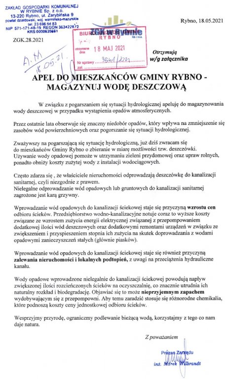 Zważywszy na pogarszającą się sytuację hydrologiczną, już dziś zwracam się do mieszkańców Gminy Rybno o zbieranie w miarę możliwości tzw. deszczówki. Używanie wody opadowej pomoże w utrzymaniu zieleni przydomowej oraz upraw rolnych, ponadto obniży koszty zużytej wody z instalacji wodociągowych.