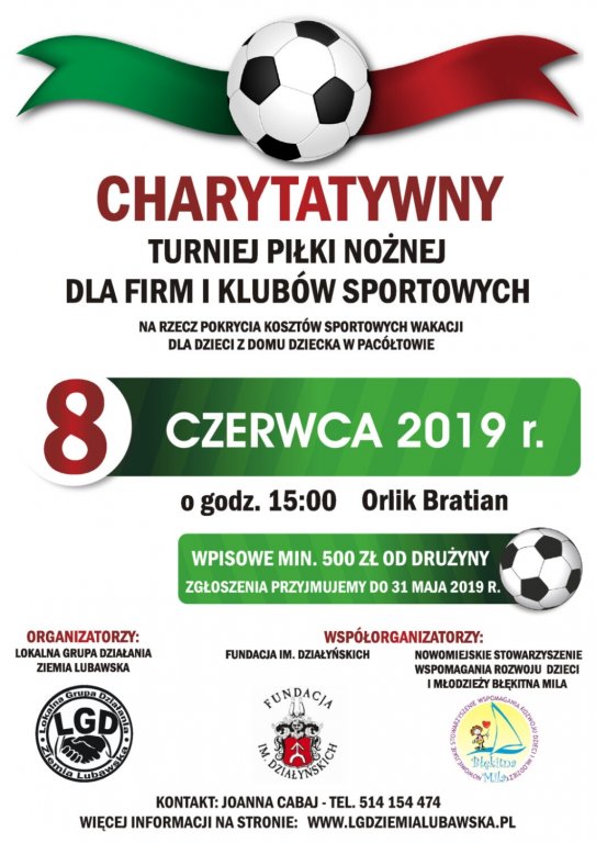 Lokalna Grupa Działania Ziemia Lubawska wraz z partnerami – Fundacją im. Działyńskich oraz Nowomiejskim Stowarzyszeniem Wspomagania Rozwoju Dzieci i Młodzieży „Błękitna Mila” zachęca fanów piłki nożnej do udziału w Charytatywnym Turnieju Piłki Nożnej dla Firm i Klubów Sportowych, z którego dochody przeznaczone będą na rzecz organizacji sportowych wakacji dla dzieci i młodzieży zamieszkujących Dom Dziecka w Pacółtowie.