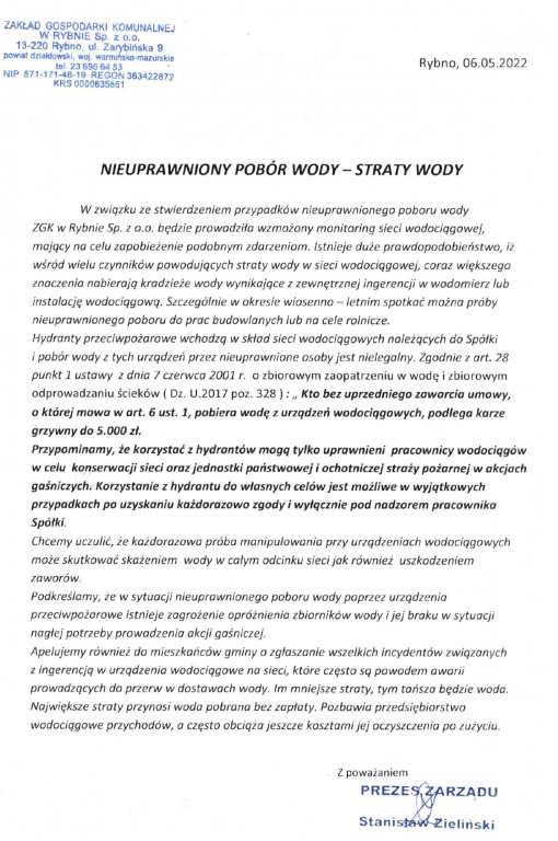 W związku ze stwierdzeniem przypadków nieuprawnionego poboru wody ZGK w Rybnie Sp. z o.o. będzie prowadziła wzmożony monitoring sieci wodociągowej, mający na celu zapobieżenie podobnym zdarzeniom.