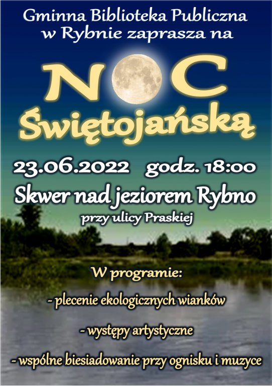 Gminna Biblioteka Publiczna w Rybnie zaprasza na NOC ŚWIĘTOJAŃSKĄ, która odbędzie się w czwartek 23 czerwca od godziny 18:00 na skwerze nad jeziorem Rybno przy ulicy Praskiej.