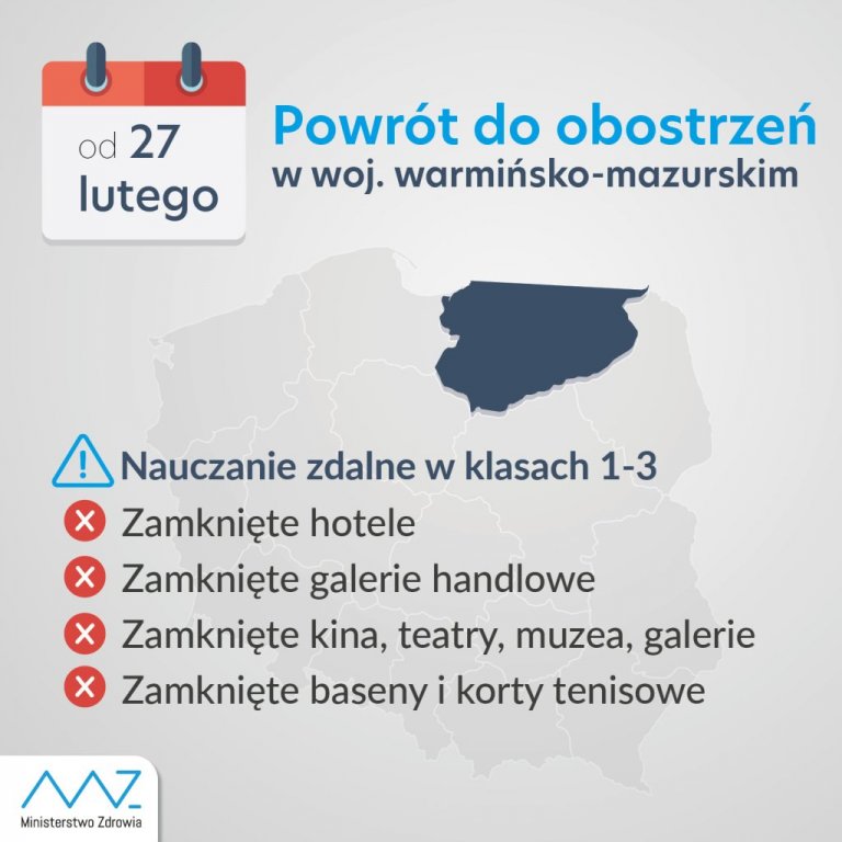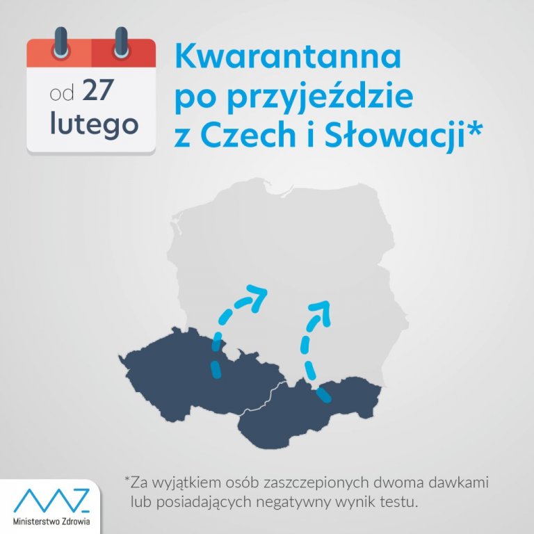 Kolejne obostrzenia wprowadzone zostają także na terenie całego kraju. Od 27 lutego wprowadzona zostanie kwarantanna dla osób przyjeżdżających do Polski z Czech i Słowacji - z wyłączeniem osób zaszczepionych dwoma dawkami szczepionki.