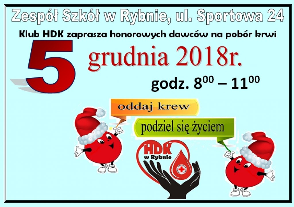 Klub Honorowych Dawców Krwi zaprasza na akcję poboru krwi, która zostanie przeprowadzona w dniu 5 grudnia 2018r. w Zespole Szkół w Rybnie.