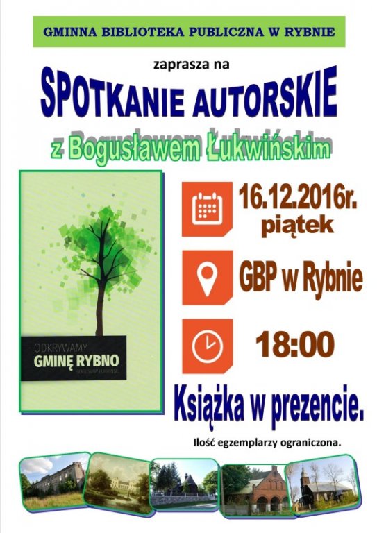 Gminna Biblioteka Publiczna w Rybnie zaprasza na spotkanie autorskie z Bogusławem Łukwińskim - autorem książki pod tytułem "Odkrywamy Gminę Rybno".
