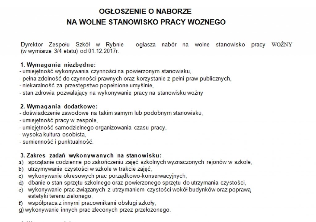 Dyrektor Zespołu Szkół w Rybnie ogłasza nabór na wolne stanowisko pracy WOŹNY (w wymiarze 3/4 etatu) od 01.12.2017r.