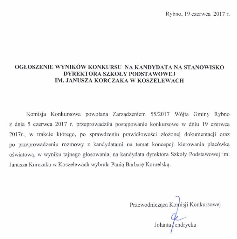 Ogłoszenie wyników konkursu na kandydata na stanowisko Dyrektora Szkoły Podstawowej im. Janusza Korczaka w Koszelewach.