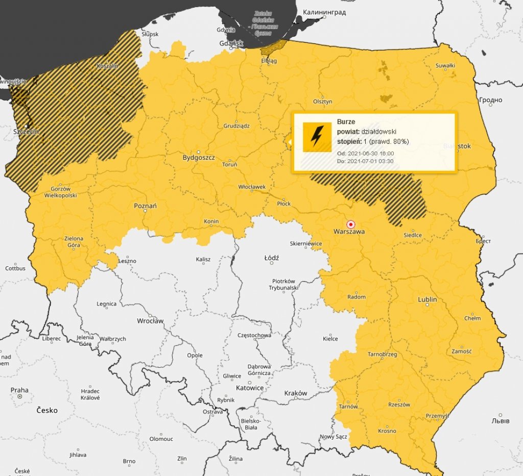 Przebieg: Prognozowane są burze, którym miejscami będą towarzyszyć silne opady deszczu od 20 mm do 30 mm, lokalnie do 40 mm oraz porywy wiatru do 90 km/h.