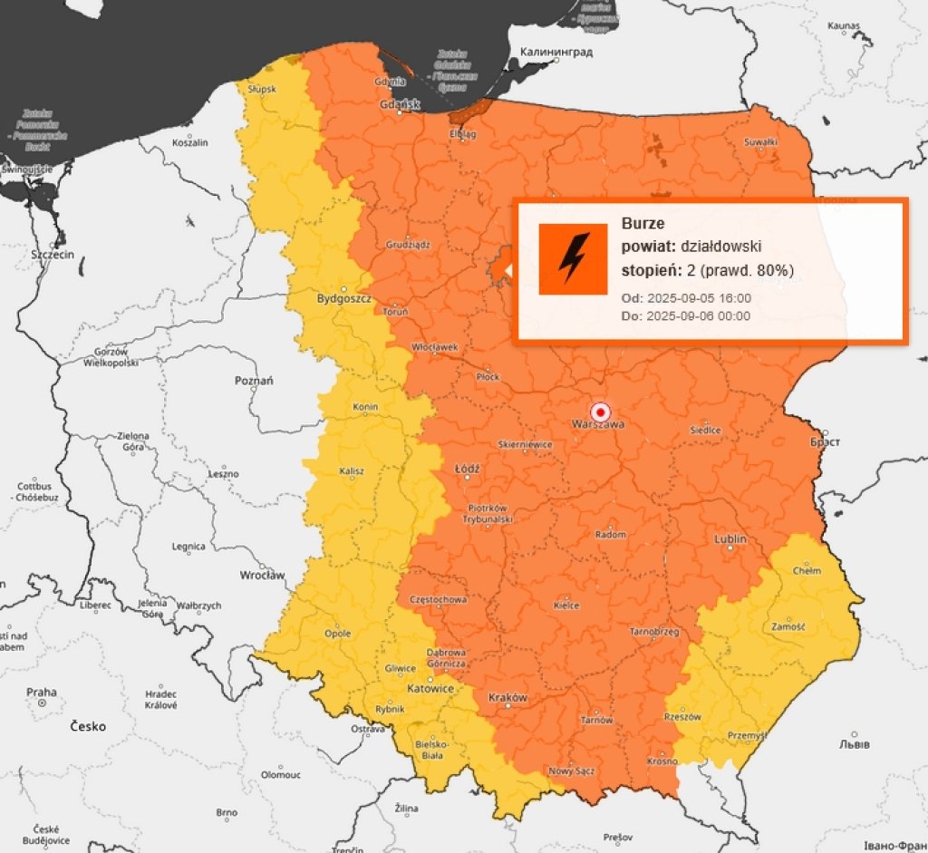 Przebieg: Prognozowane są burze, którym miejscami będą towarzyszyć bardzo silne opady deszczu od 35 mm do 50 mm, oraz porywy wiatru do 85 km/h. Lokalnie grad.
