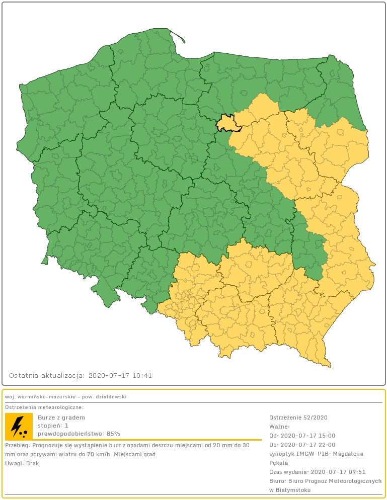 Przebieg: Prognozuje się wystąpienie burz z opadami deszczu miejscami od 30 mm do 40 mm oraz porywami wiatru lokalnie do 110 km/h. Miejscami grad.