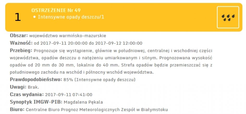 Przebieg: Prognozuje się wystąpienie, głównie w południowej, centralnej i wschodniej części województwa, opadów deszczu o natężeniu umiarkowanym i silnym. Prognozowana wysokość opadów od 20 mm do 30 mm, lokalnie do 40 mm. Strefa opadów będzie przemieszczać się z południowego zachodu na wschód i północny wschód województwa.