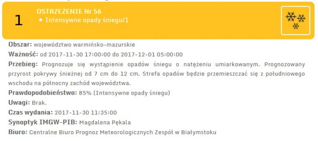 Przebieg: Prognozuje się wystąpienie opadów śniegu o natężeniu umiarkowanym. Prognozowany przyrost pokrywy śnieżnej od 7 cm do 12 cm. Strefa opadów będzie przemieszczać się z południowego wschodu na północny zachód województwa.
