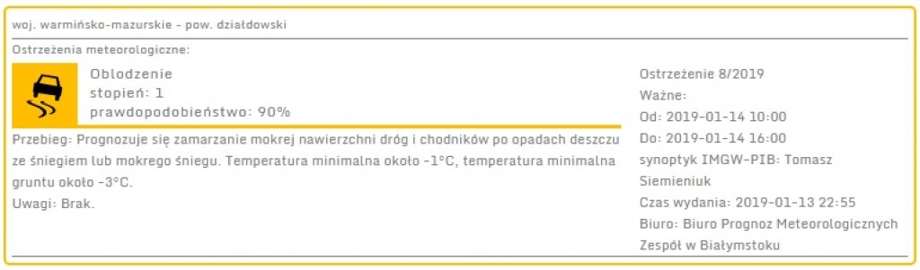 Przebieg: Prognozuje się zamarzanie mokrej nawierzchni dróg i chodników po opadach deszczu ze śniegiem lub mokrego śniegu. Temperatura minimalna około -1°C, temperatura minimalna gruntu około -3°C.
