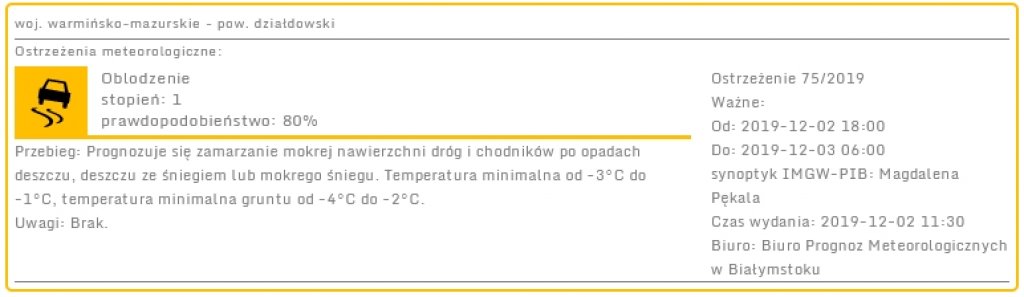 Przebieg: Prognozuje się zamarzanie mokrej nawierzchni dróg i chodników po opadach deszczu, deszczu ze śniegiem lub mokrego śniegu. Temperatura minimalna od -3°C do -1°C, temperatura minimalna gruntu od -4°C do -2°C.