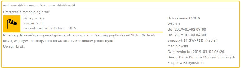 Przebieg: Przewiduje się wystąpienie silnego wiatru o średniej prędkości od 30 km/h do 45 km/h, w porywach miejscami do 80 km/h z kierunków północnych.
