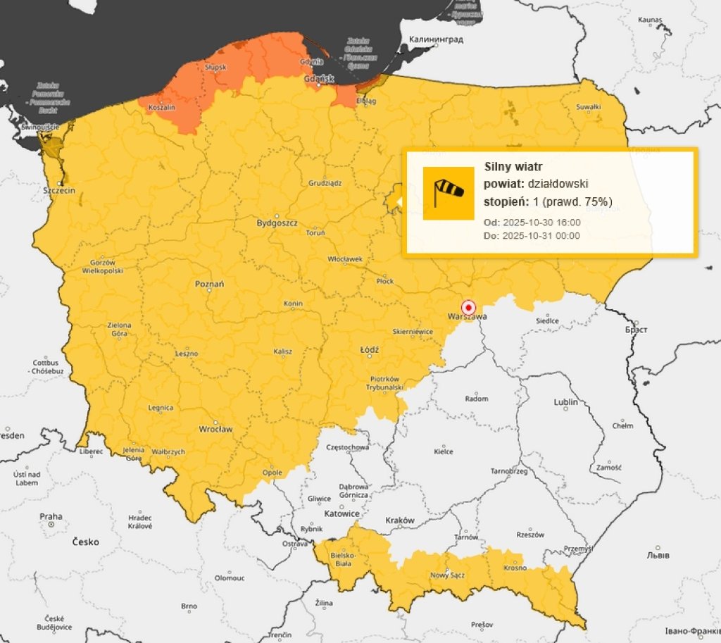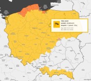Przebieg: Miejscami prognozuje się wystąpienie silnego wiatru o średniej prędkości do 40 km/h, w porywach do 75 km/h, z południowego zachodu i zachodu.