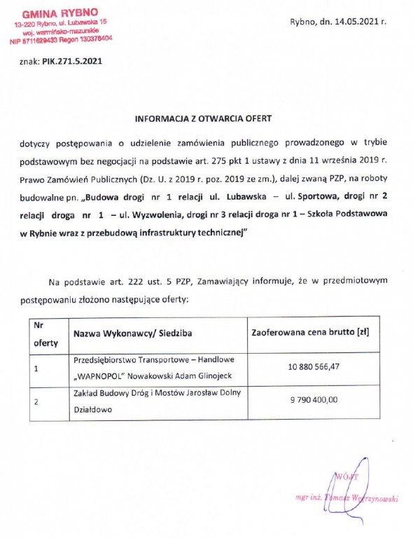 W dniu 14.05.2021 r. odbyło się otwarcie ofert w ramach postępowania o udzielenie zamówienia pn. „Budowa drogi nr 1 relacji ul. Lubawska – ul. Sportowa, drogi nr 2 relacji droga nr 1 – ul. Wyzwolenia, drogi nr 3 relacji droga nr 1 – Szkoła Podstawowa w Rybnie wraz z przebudową infrastruktury technicznej”.
