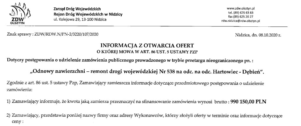 Dnia 08.10.2020 nastąpiło otwarcie ofert na wykonanie zadania ” Odnowa nawierzchni – remont drogi wojewódzkiej nr 538 na odc. Hartowiec – Dębień”.