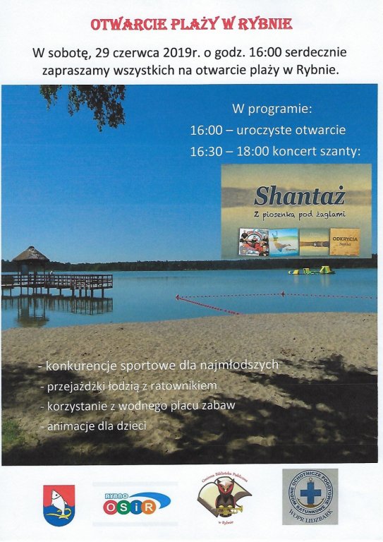 Zapraszamy na otwarcie plaży w Rybnie, które odbędzie się w sobotę 29 czerwca 2019r. o godzinie 16:00.