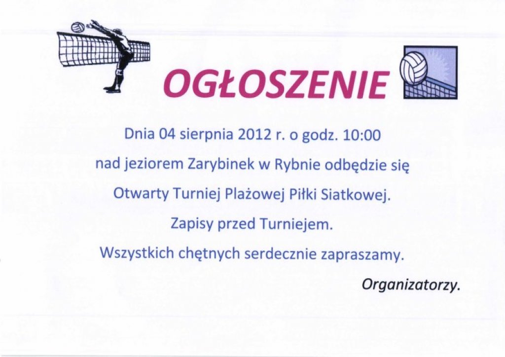Turniej rozpocznie się dnia 4 sierpnia (sobota) o godz. 10:00 na plaży nad jeziorem Zarybińskim. Zapisy uczestników będą się odbywały bezpośrednio przed rozpoczęciem zawodów.