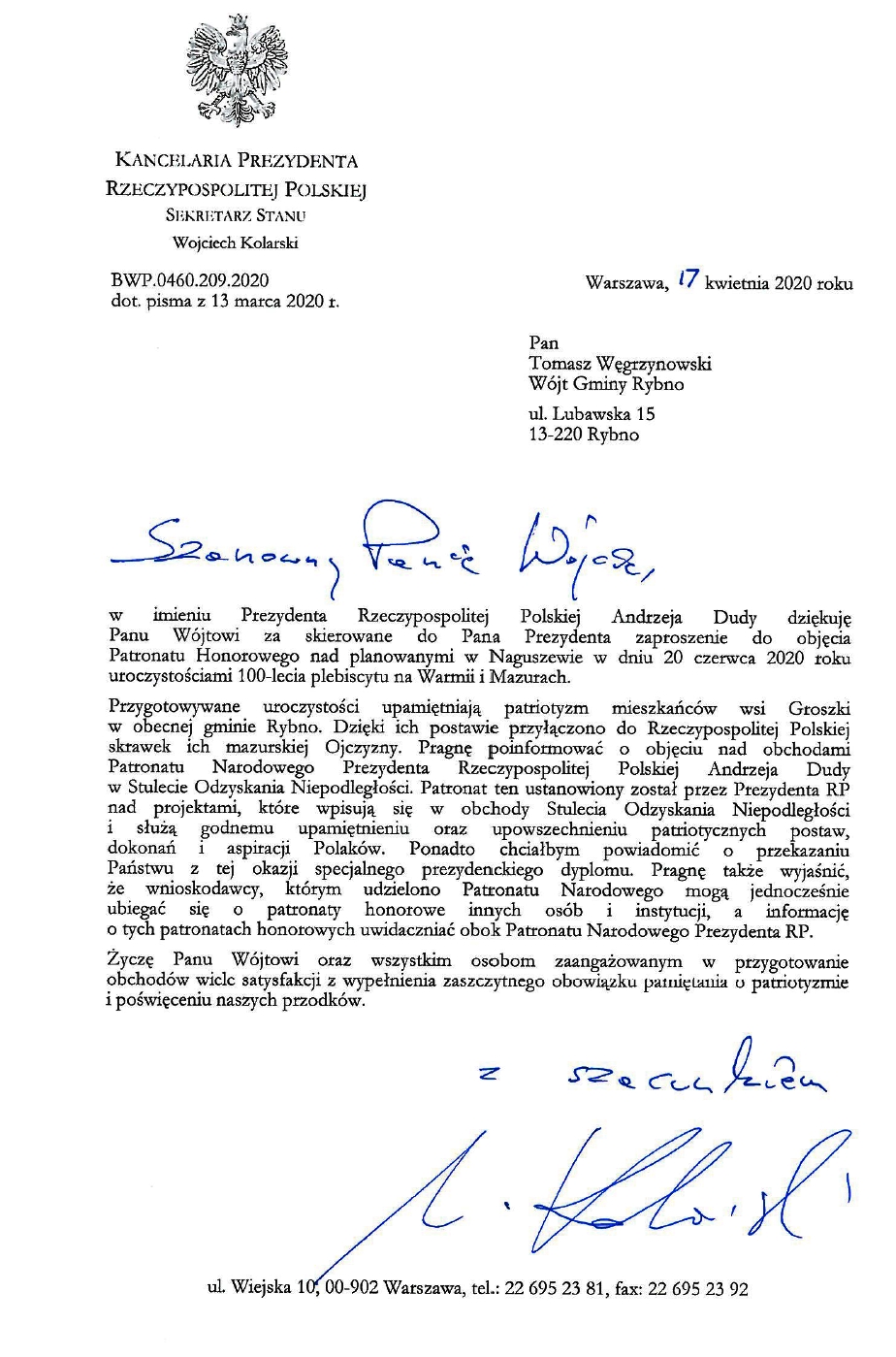 Miło nam poinformować, że Prezydent Andrzej Duda objął Honorowym Patronatem uroczyste obchody 100-lecia Plebiscytu na Warmii i Mazurach organizowane przez naszą Gminę.