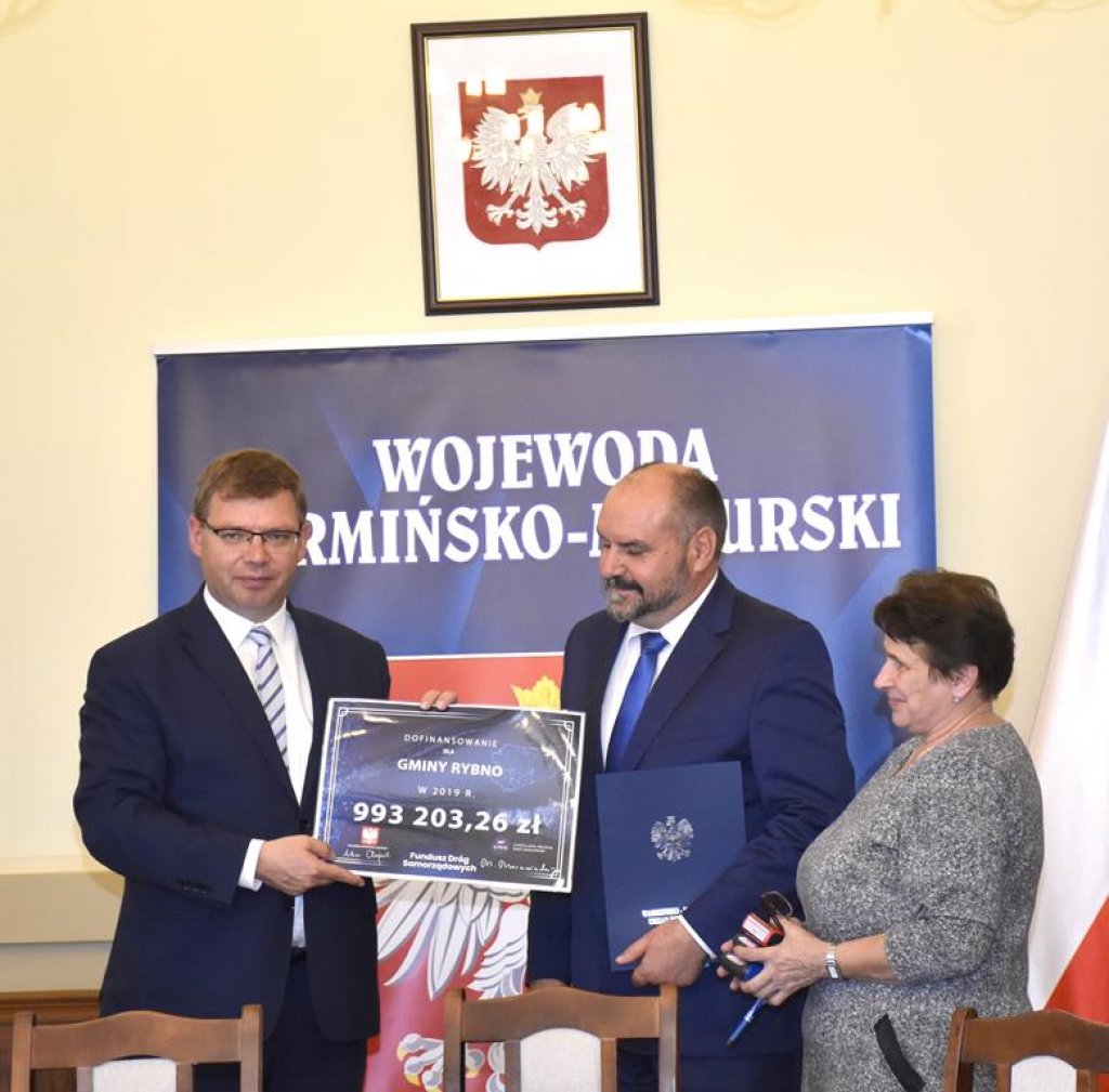W dniu 25 września 2019 r. Wójt Gminy Rybno – Tomasz Węgrzynowski z Skarbnikiem – Zdzisławą Kanicz podpisali z Wojewodą Warmińsko-Mazurskim – Arturem Chojeckim pierwszą z umów na budowę drogi z Funduszu Dróg Samorządowych.