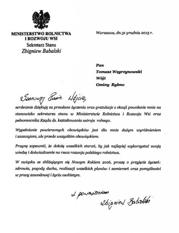 Sekretarz Stanu w Ministerstwie Rolnictwa i Rozwoju Wsi Zbigniew Babalski podziękował Wójtowi Gminy Rybno za gratulacje przekazane w związku objęciem funkcji.