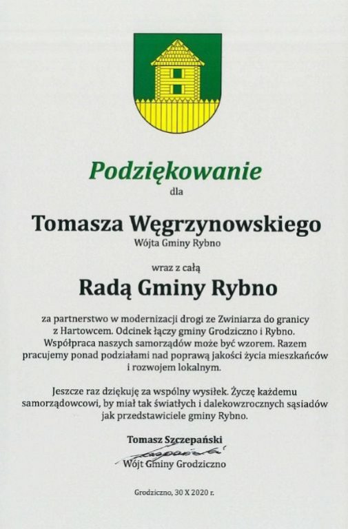 za partnerstwo w modernizacji drogi ze Zwiniarza do granicy z Hartowcem.