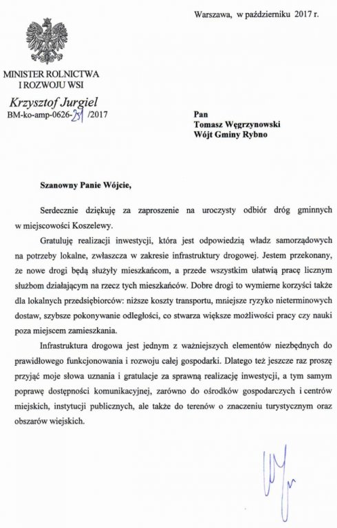 Podziękowanie Ministra Rolnictwa i Rozwoju Wsi za zaproszenie na odbiór dróg w miejscowości Koszelewy.