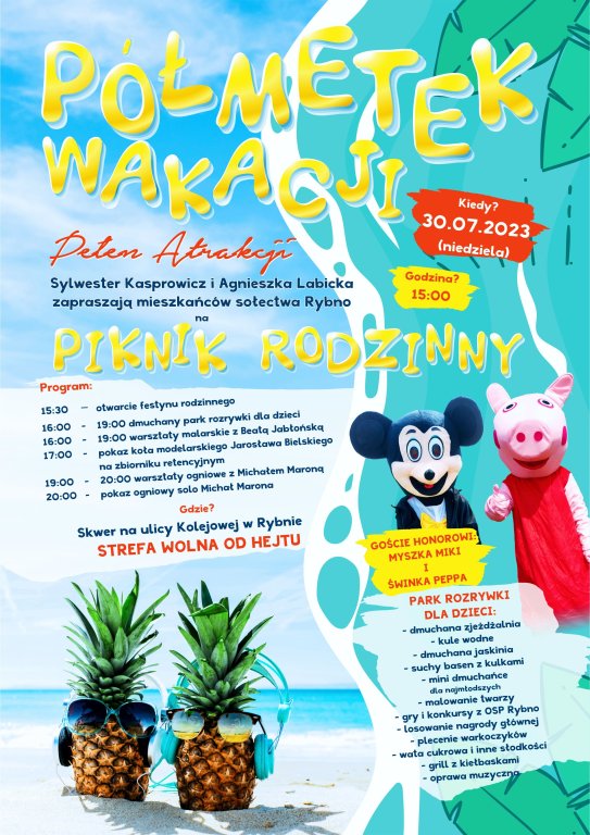 Sylwester Kasprowicz i Agnieszka Labicka zapraszają mieszkańców sołectwa Rybno na PIKNIK RODZINNY.