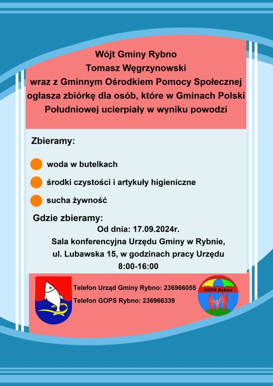Drodzy mieszkańcy Gminy Rybno. Zwracam się do Was z prośbą o pomoc dla mieszkańców terenów dotkniętych klęską powodzi, jaka nawiedziła południowo-zachodnią część naszego kraju.
