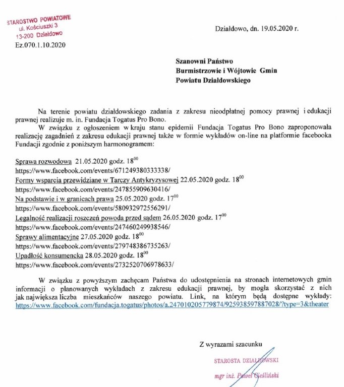 W związku z ogłoszeniem w kraju stanu epidemii ww. fundacja zaproponowała realizację zagadnień z zakresu edukacji prawnej także w formie wykładów on-line na platformie Facebooka zgodnie z poniższym harmonogramem: