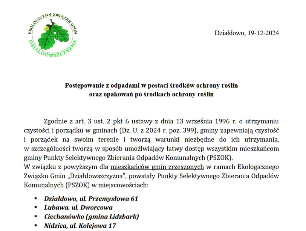 Ekologiczny Związek Gmin „Działdowszczyzna”, jako organ który przejął od gmin wszelkie prawa i obowiązki związane z gospodarką odpadami, pojął stosowne działania w celu dostosowania PSZOK do wymogu przyjmowania odpadów niebezpiecznych w postaci odpadów środków ochrony roślin min. poprzez zakup specjalistycznych pojemników, zapewnienie profesjonalnej utylizacji przyjętych odpadów oraz szkolenie pracowników. Mając na uwadze obecną sytuację, w której wzmożone zainteresowanie w/w odpadami, wpływa na wydłużenie terminów zakupu pojemników i znalezienia odpowiednich firm, które zajmą się profesjonalnym zagospodarowaniem odpadów, zakończenie opisanych działań planowane jest do końca I kwartału 2025 r.