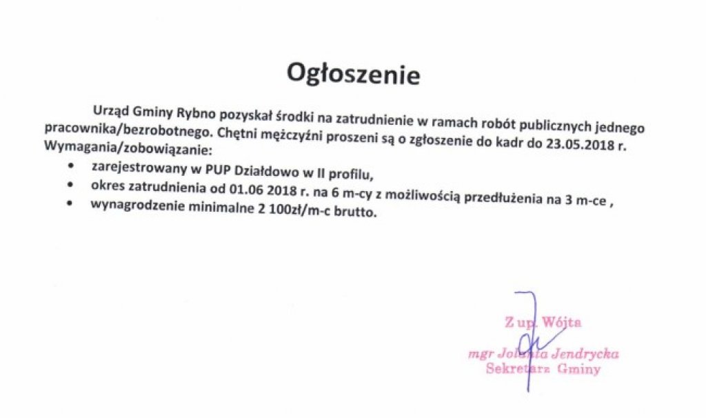 Urząd Gminy Rybno pozyskał środki na zatrudnienie w ramach robót publicznych jednego pracownika/bezrobotnego.