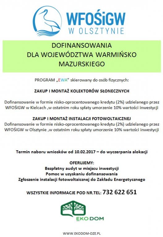 Wojewódzki Fundusz Ochrony Środowiska i Gospodarki Wodnej realizuje program "EWA" skierowany do osób fizycznych.