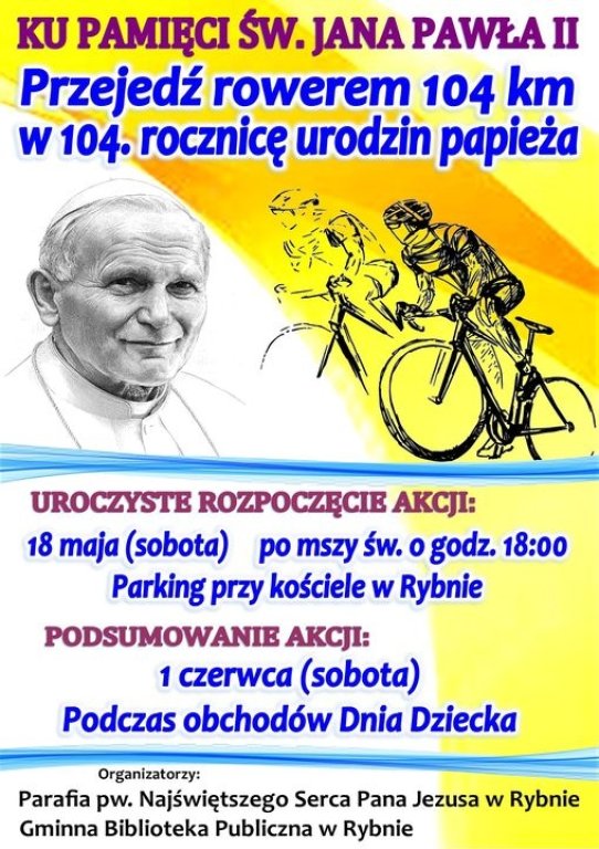 Gminna Biblioteka Publiczna w Rybnie zachęca do udziału w akcji „Przejedź rowerem 104 km w 104. rocznicę urodzin papieża”.