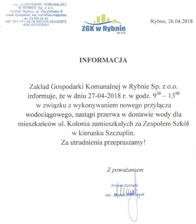 Jak informuje Zakład Gospodarki Komunalnej w Rybnie sp. z o. o. w dniu jutrzejszym - 27 kwietnia 2018 r. w godzinach od 09:30 do 13:00 nastąpi planowana przerwa w dostawie wody. Komunikat dotyczy mieszkańców miejscowości Rybno - ulica Kolonia za Zespołem Szkół w kierunku Szczuplin.