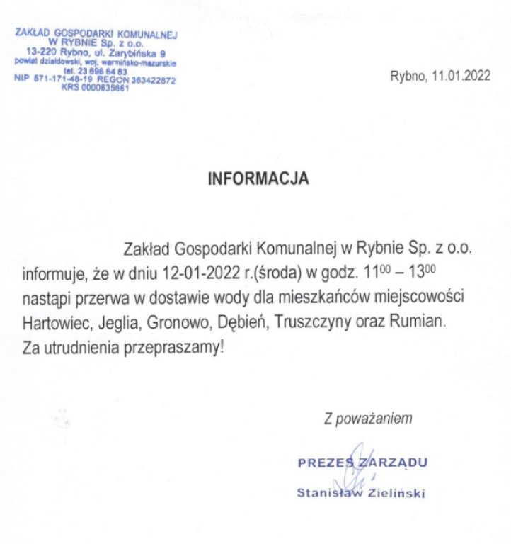 Zakład Gospodarki Komunalnej w Rybnie Sp. z o.o. informuje, że w dniu 12-01-2022 r. (środa) w godz. 11:00-13:00 nastąpi przerwa w dostawie wody dla mieszkańców miejscowości Hartowiec, Jeglia, Gronowo, Dębień, Truszczyny oraz Rumian.