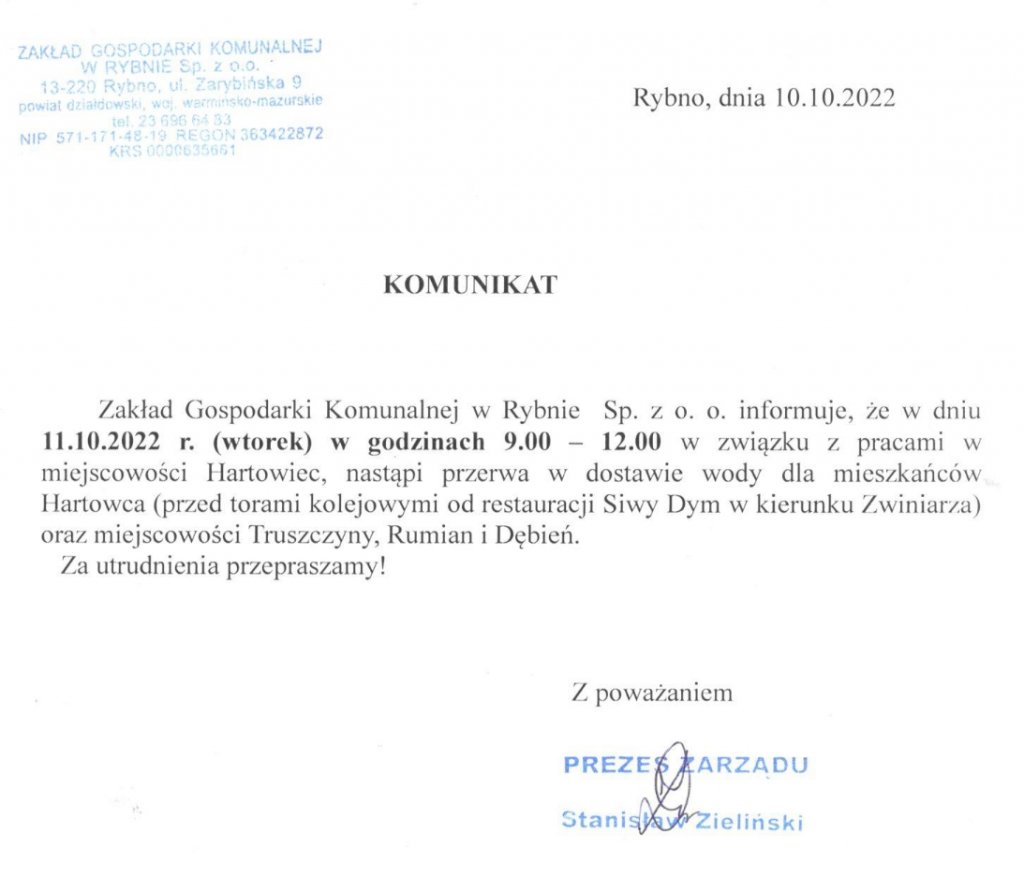 Zakład Gospodarki Komunalnej w Rybnie Sp. z o. o. informuje, że w dniu 11.10.2022r . (wtorek) w godz. 9:00-12:00 w związku z pracami w miejscowości Hartowiec, nastąpi przerwa w dostawie wody dla mieszkańców Hartowca (przed torami kolejowymi od restauracji Siwy Dym w kierunku Zwiniarza) oraz miejscowości Truszczyny, Rumian i Dębień.