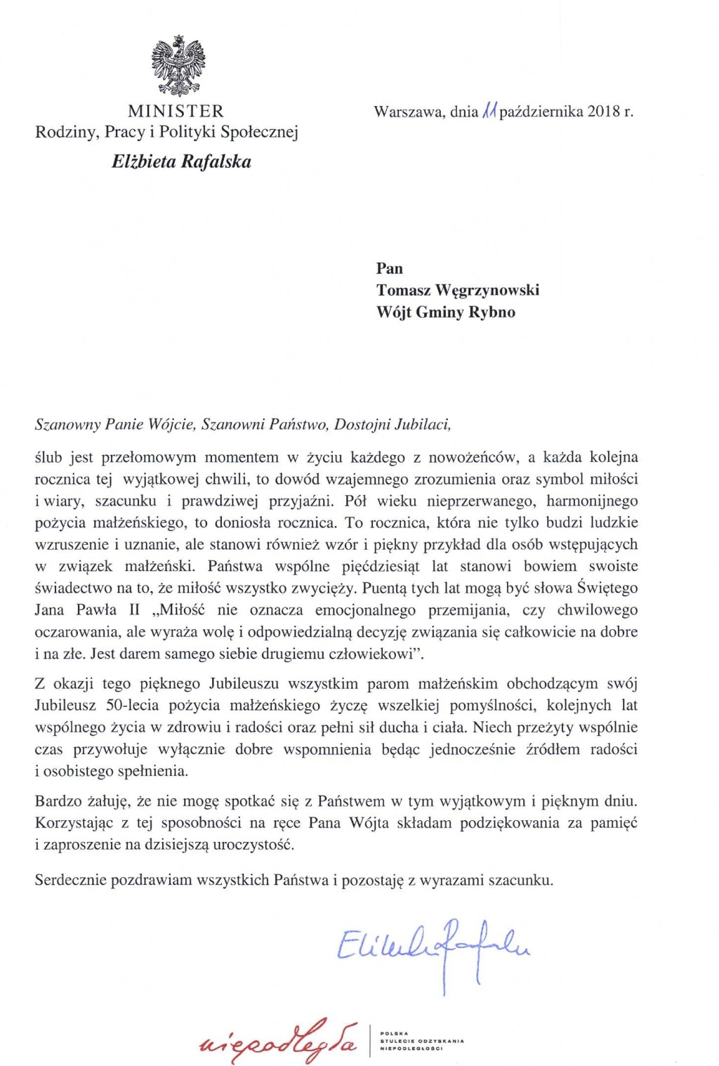 Podczas uroczystości tradycyjnie były przemówienia, pamiątkowe listy gratulacyjne i upominki dla jubilatów. Specjalnie dla honorowych gości odbył się recital Arlety Lemańskiej pn. „Tyle Miłości”. Medale za Długoletnie Pożycie Małżeńskie przyznane przez prezydenta RP wręczał gospodarz spotkania: Wójt Gminy Rybno – Tomasz Węgrzynowski oraz Przewodniczący Rady Gminy Rybno – Andrzej Kornacki, Radny Gminy Rybno – Czesław Mederski i Skarbnik UG w Rybnie – Zdzisława Kanicz.