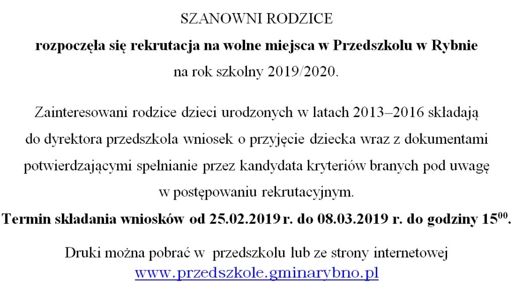 Szanowni Rodzice rozpoczęła się rekrutacja na wolne miejsca w Przedszkolu w Rybnie na rok szkolny 2019/2020.