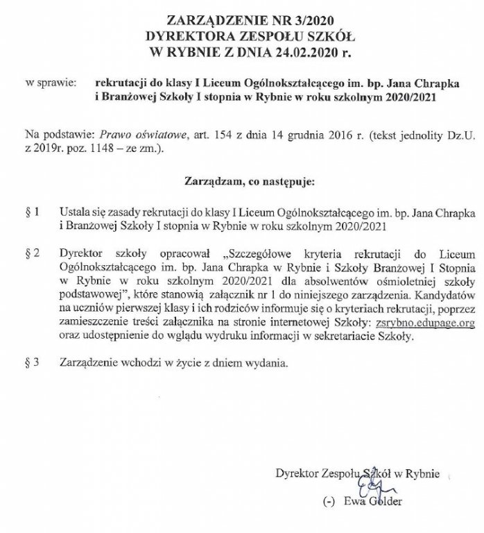 Dyrektor Zespołu Szkół w Rybnie wydał zarządzenie w sprawie rekrutacji do klasy 1 Liceum Ogólnokształcącego im. bp. Jana Chrapka i Branżowej Szkoły I stopnia w Rybnie w roku szkolnym 2020/2021.