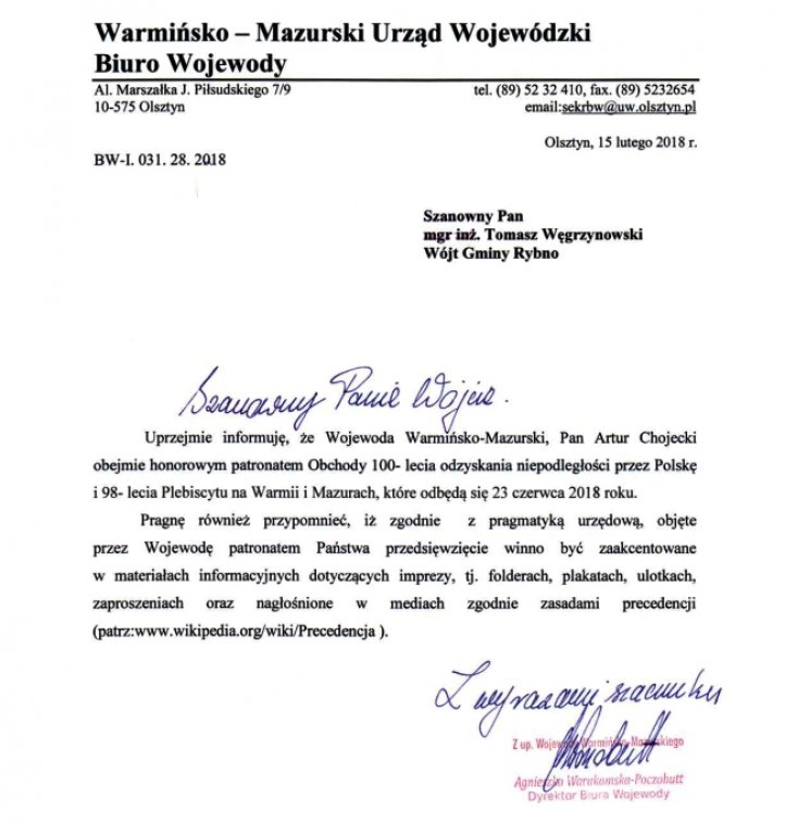 Wojewoda Warmińsko-Mazurski Pan Artur Chojecki obejmie honorowym patronatem Obchody 100-lecia odzyskania przez Polskę niepodległości i 98-lecia Plebiscytu na Warmii i Mazurach, które w dniu 23 czerwca 2018r. odbędą się w Groszkach.