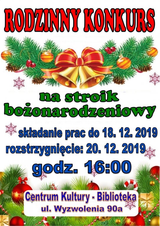 Gminna Biblioteka Publiczna w Rybnie zaprasza do udziału w Rodzinnym Konkursie Bożonarodzeniowym! Termin składania prac – 18.12.2019 r. (środa). Rozstrzygnięcie konkursu – 20.12. 2019 r. (piątek), godz. 16:00.