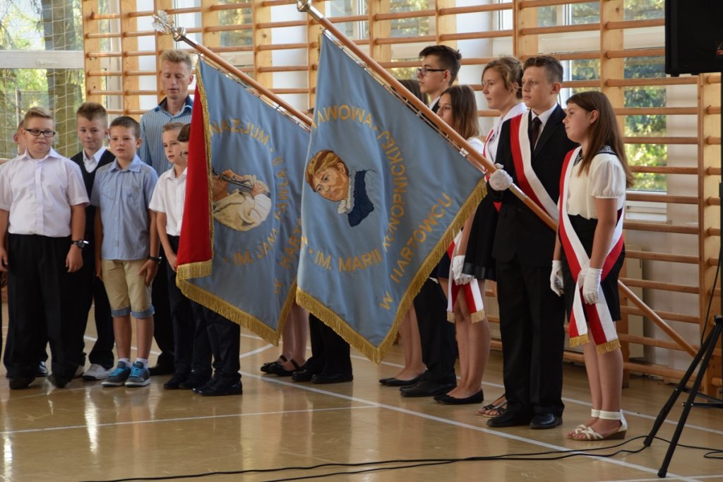 O godz. 10:00 w Szkole Podstawowej im. Marii Konopnickiej oraz Niepublicznym Gimnazjum im. Jana Pawła II w Hartowcu dyrektor Bogdan Łukwiński powitał wszystkich uczniów, nauczycieli, pracowników obsługi i administracji oraz zaproszonych gości: Wójta Gminy Rybno – Tomasza Węgrzynowskiego, Inspektora ds. Oświaty – Jana Sokołowskiego oraz ks. Sławomira Skonieczkę.